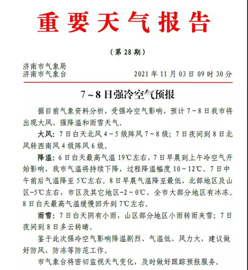 鉴于此次强冷空气影响降温剧烈、气温低、风力大,建议做好防风、防冻等防范工作。市气象台将密切监视天气变化,及时做好跟踪预报服务。