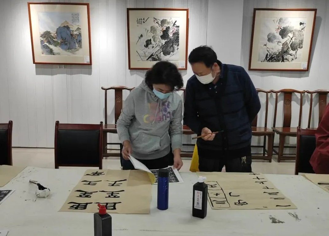 活动中,王老师走到学员中间,手把手指导学员们习字,给大家讲解书法运笔技巧,纠正提笔姿势,传授书法真经,不断提出意见和建议。
