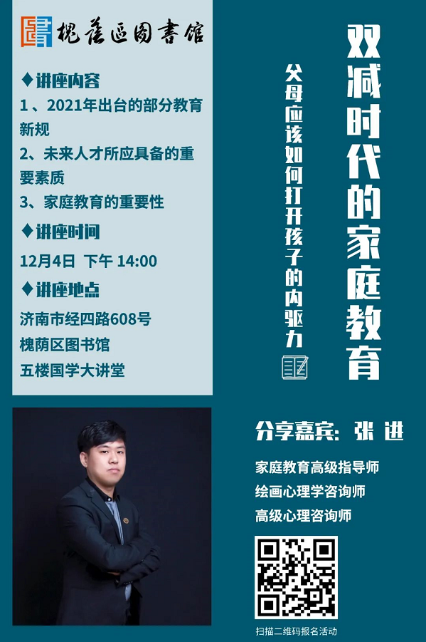 讲座简介:2021年7月24日,中共中央办公厅、国务院办公厅印发《关于进一步减轻义务教育阶段学生作业负担和校外培训负担的意见》。要求各地区各部门结合实际认真贯彻落实。为丰富广大读者的精神文化生活,为大众提供多元化的文化活动,特邀请家庭教育高级指导师张进老师来馆开展“双减时代的家庭教育——父母应该如何打开孩子的内驱力”分享会,为大家解读双减时代家庭教育需要注意的事项。