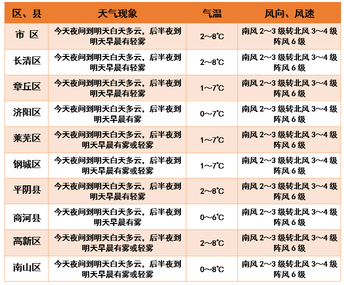 明天夜间到17日晴间多云,北风转南风3~4级阵风6级,最低气温济阳区、莱芜区、钢城区、商河县、南山区-8℃左右,市区及其它区县-5℃左右,最高气温1℃左右。