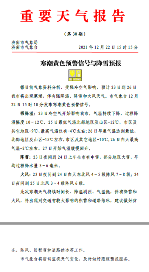 12月22日,记者从济南市气象局获悉,据目前气象资料分析,受强冷空气影响,预计23日到26日济南市将出现寒潮,伴有强降温、降雪和大风天气。市气象台12月22日15时10分发布寒湖黄色预警信号。