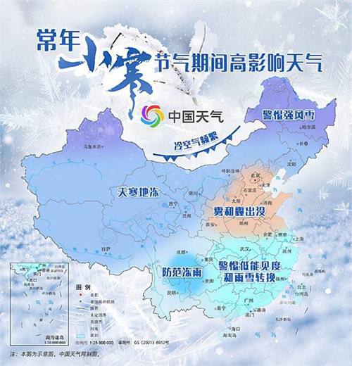 常年小寒节气期间,南方气温也是明显下降,秦岭、淮河一线平均气温在0℃左右,江南、华南北部地区处于一年中较为干冷的时期,但仍需警惕低能见度和雨雪天气的转换,西南地区还要防范冻雨天气的危害。