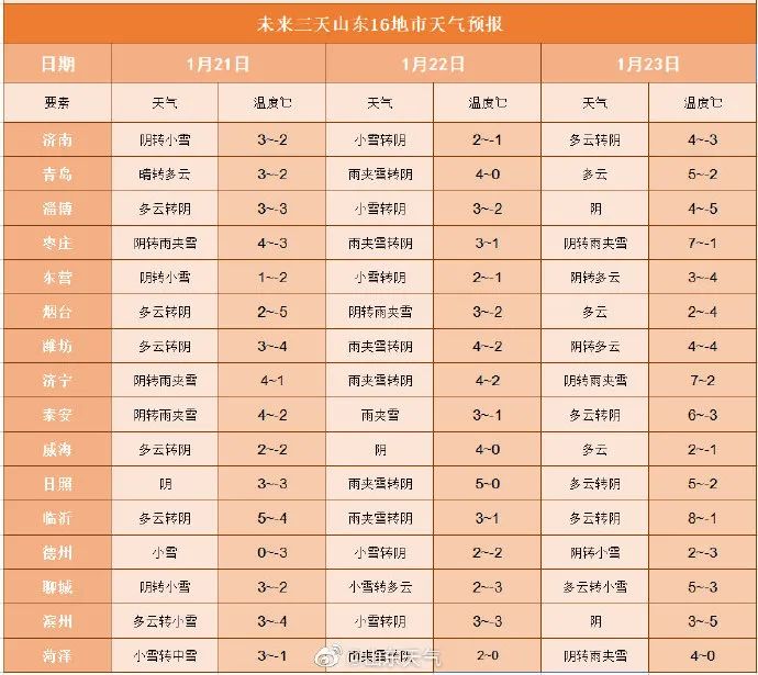 21日白天到夜间,鲁西南地区天气多云转阴有小到中雪转雨夹雪,鲁西北地区天气多云转阴有小雪,鲁中的西部地区天气多云转阴有雨夹雪,其他地区天气多云。半岛地区北风短时南风3~4级,鲁西北和鲁西南地区北风2~3级,其他地区北风短时南风2~3级。
