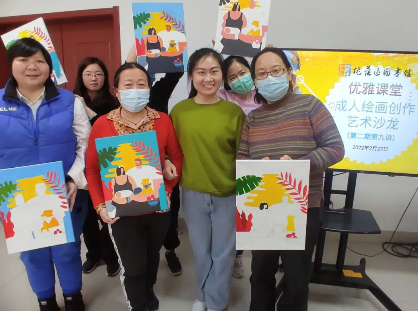 在老师的指导下,学员们顺利完成了自己的绘画作品。课程结束后,读者们畅所欲言,气氛热烈,各自讨论了本节课的收获体会,本次绘画课也在一片欢声笑语中画上了句号。