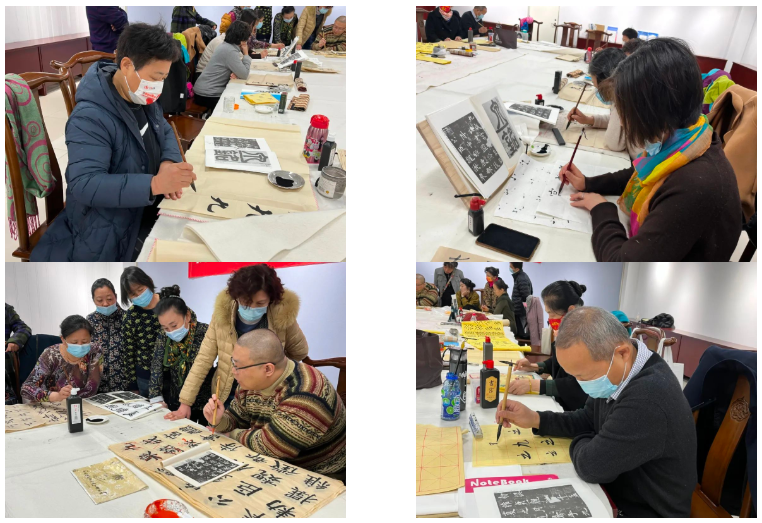 张老师手把手指导学员们习字,给大家讲解书法运笔技巧,纠正提笔姿势,不断提出意见和建议。在老师的指导下,大家的书写水平有了明显提升。