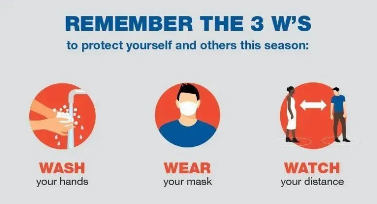 “3W's”即洗手、戴口罩和保持社交距离。戴口罩是尤为重要的一条,一定要遵守。