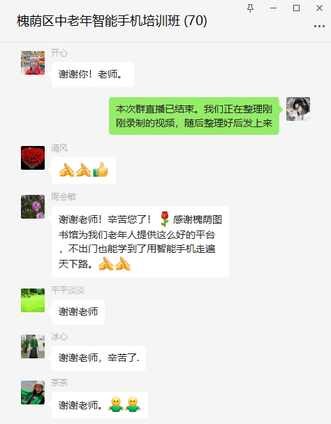 线上直播课结束后,大家都积极地在群里做出了回应,纷纷表示线上直播课的形式新颖,使不能到馆听课的读者在线上即可学习到智能手机使用知识,非常方便。
