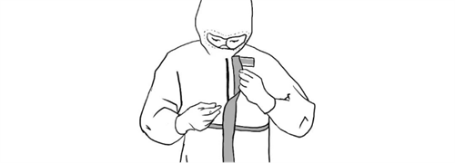 脱医用防护服:按照“胶条-拉链-帽子-正身-下身”的顺序脱下;手只接触内侧,不接触外侧,外侧不可接触到内部衣物;不可一脱到底,边脱边卷。