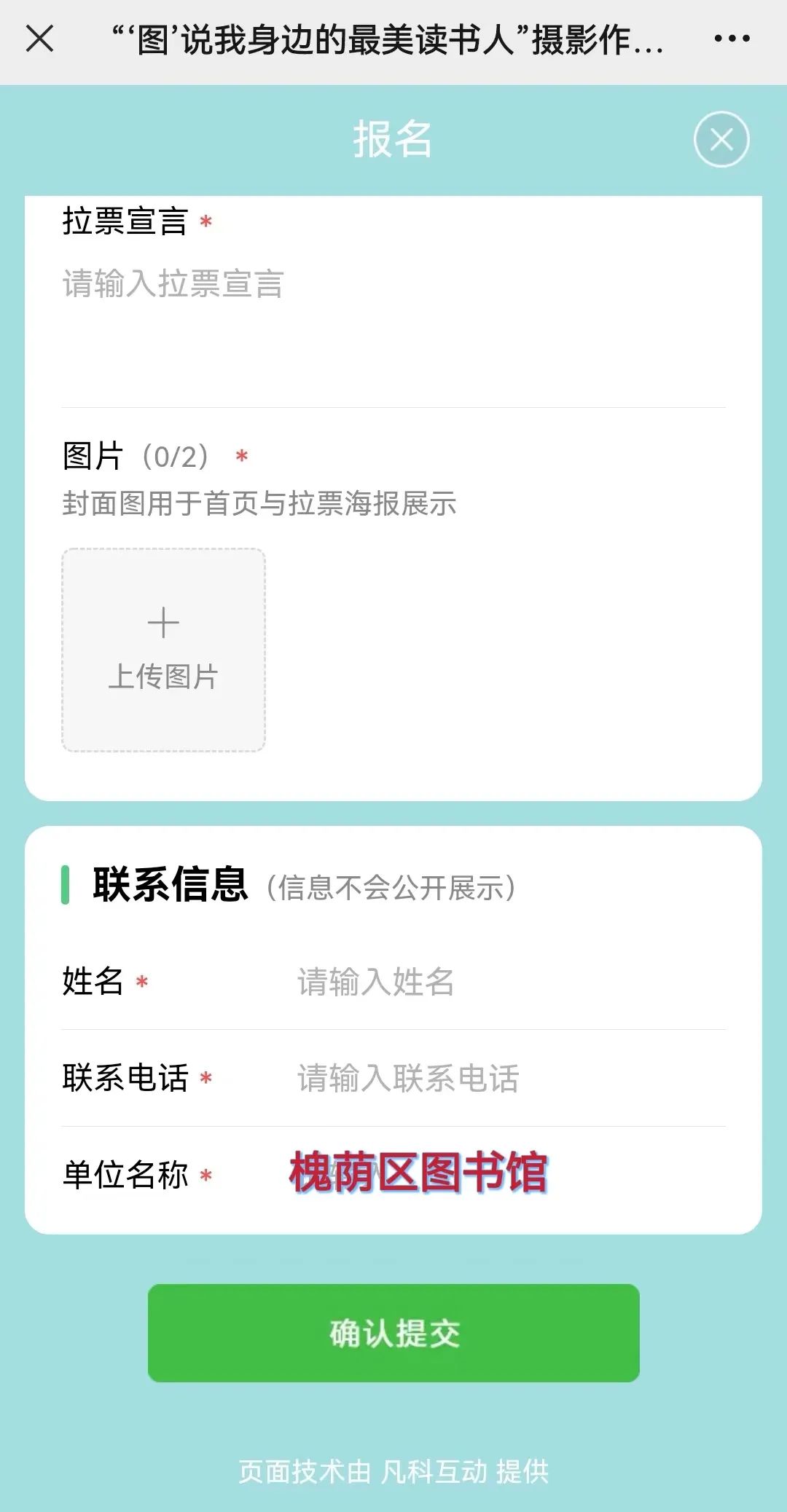 请参赛选手在线提交作品后将参赛信息(姓名、联系方式、作品名称、参赛照片 JPG 格式,文件大小不超过 10M、100 字以内的文字描述)同步发送到槐图公共邮箱:hylib@126.com,并在邮件主题处标注“ 图说我身边的最美读书人摄影作品征集活动报名+参赛者姓名”。邮件发送成功后请电话确认报名信息0531—87589224(工作时间 9:00—17:00)。参赛选手可关注槐荫区图书馆微信公众号,及时了解活动详情。