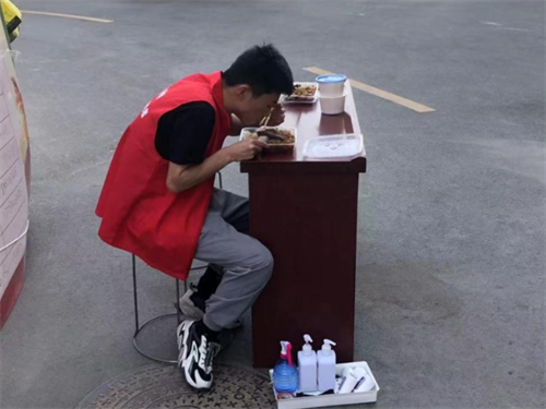 疫情就是命令,防控就是责任。在上下齐心奋力抗击疫情的时候,吴家堡街道东赵村青年志愿者刘悦,作为一名年轻小伙子,和其他同事们迅速投入工作,站在了防控疫情的第一线,每次核酸任务一下发,需要志愿者帮忙时,他总是踊跃报名。晴天、阴天、雨天,他都不会缺席。辖区管控时,每天都有他的身影。在大风中就餐、在雨天中坚守,早已是他的日常。核酸采样辅助登记员、点位长、秩序维护员来回切换,哪个岗位需要就上哪个岗位。