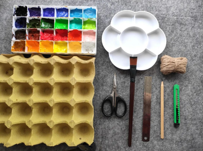 本次活动需要准备的物料有:鸡蛋托、细绳1根、黑色马克笔、彩色卡纸(橙色、黄色)、丙烯颜料(橙色、绿色、蓝色、土黄色)、笔刷、调色盘、戳针。