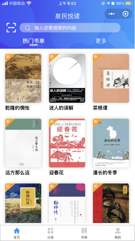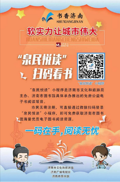 为丰富市民读者居家期间的精神文化生活,由济南市文化和旅游局主办、济南市图书馆承办的大型免费公益电子书阅读项目——“泉民悦读”扫码看书小程序正式上线。在这里,足不出户就可以实现看书、听书、期刊、视频分类阅读。