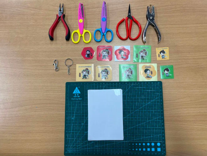 本期活动需要准备的物料有:核酸检测小贴纸、冷裱膜、钥匙环、打孔器、尖嘴小钳子、花边剪刀。