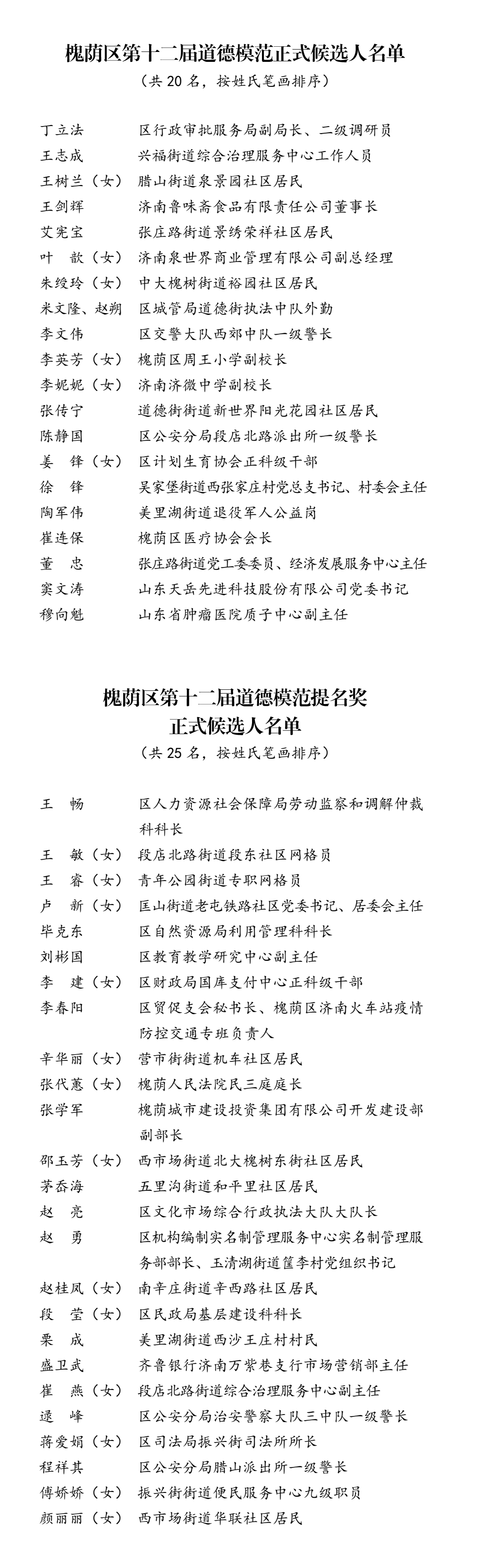 槐荫区文明委于2021年12月启动了第十二届道德模范评选活动,全区各部门单位高度重视,精心组织,积极参与,一大批品德高尚、事迹突出的先进人物被推选出来。按照有关程序,经推荐、审核、征求意见等环节确定了20名道德模范正式候选人和25名道德模范提名奖正式候选人。