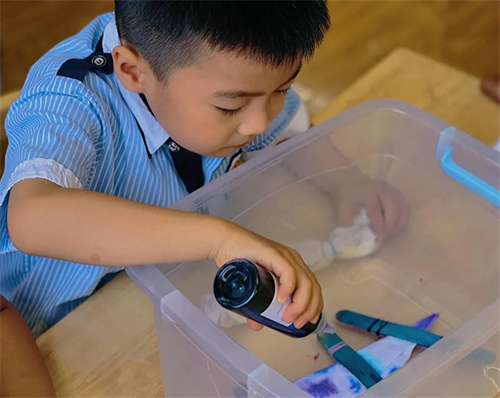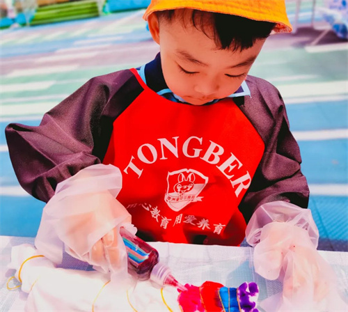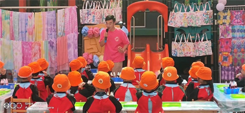 活动中少儿频道知名主持人“松鼠哥哥”向孩子们生动讲解了扎染的故事,通过与孩子们亲切互动,让孩子们了解扎染的悠久历史,感受扎染艺术的丰富文化内涵。随后,在欣赏了老师的现场示范的扎染方法后,孩子们一个个跃跃欲试。在志愿者们的帮助下,大班孩子们先将T恤浸泡,然后将橡皮筋缠在浸泡后的白色T恤上,最后用染料上色。中小班的孩子一边折手帕一边重复老师的儿歌:“折个三角形,再折一个变小船。”在染色的过程中,大家根据自己对色彩的理解和喜好,小心翼翼地将颜料染在自己扎好的造型中,一个个专注认真的表情,完全陶醉在“扎染”的世界里。