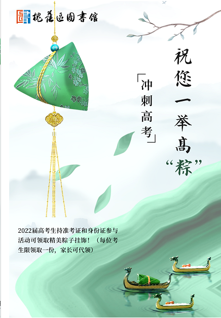 悠悠艾草香,绵绵情意长。在端午节即将来临之际,恰逢2022年高考在即。心系高三、祈愿高考,是大家的共同心愿。2022年6月3日-5日,槐荫区新时代文明实践中心、槐荫区图书馆不仅为各位考生呐喊助威,而且贴心的准备了端午“高粽”锦囊,凡2022年高考考生凭准考证和身份证到槐图一楼总服务台领取端午“高粽”锦囊一份(家长可代领)数量有限、先到先得。