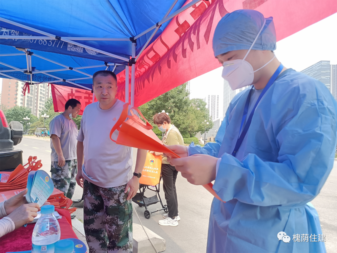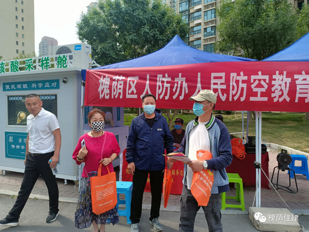 在恒大雅苑社区广场,兴福街道办事处城管科和社区工作者与人防宣传人员一道悬挂起“人防教育宣传活动进社区”和“遵守安全生产法、当好第一责任人”等主题宣传条幅,陈列好人防法规和防空防灾知识展板。在宣传台前,宣传人员向刚刚做完核酸检测的社区居民发放人防、消防等宣传资料和印有人防工程安全保护法律条文的环保手提袋等宣传品。