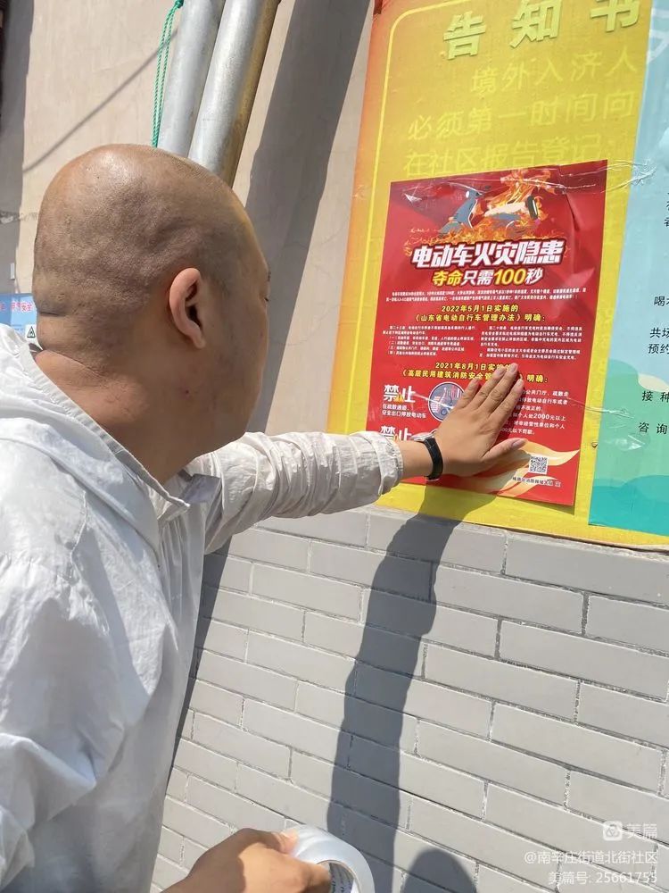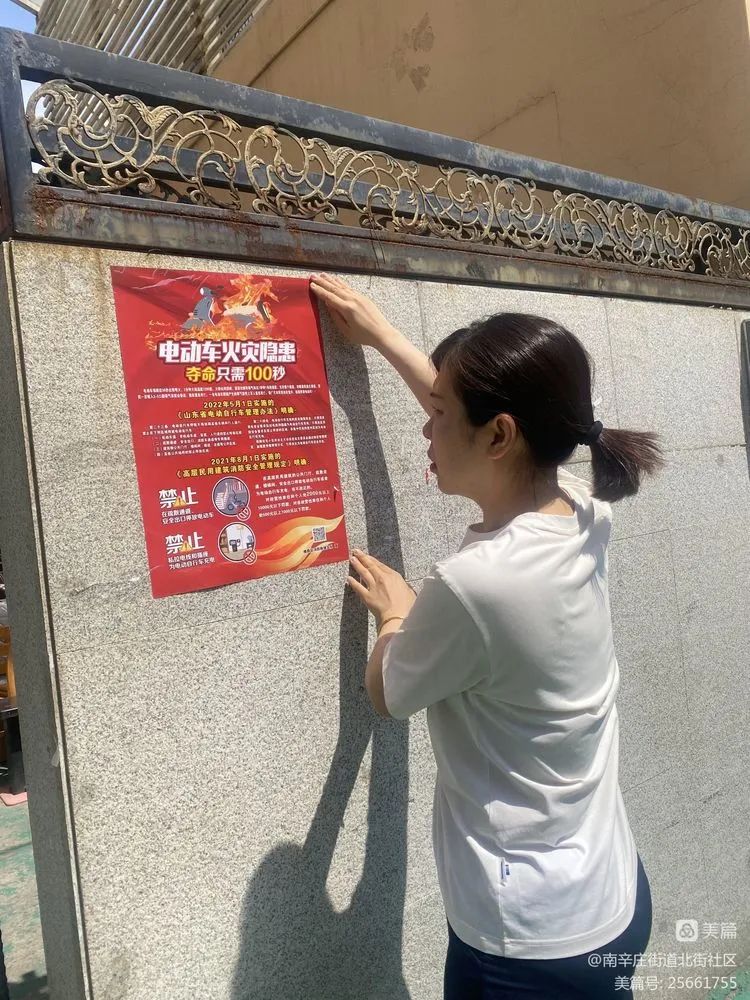 为切实提高辖区居民的消防安全意识,积极宣传贯彻《中华人民共和国公安部关于规范电动车停放充电加强火灾防范的通告》,南辛北街社区安全员在辖区全面宣传并张贴电动车消防隐患宣传海报,向小区居民宣传如何安全地给电瓶车充电。