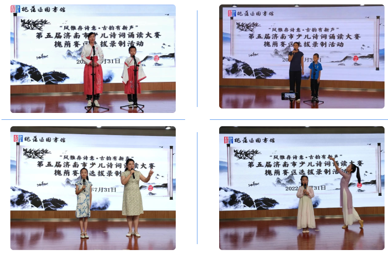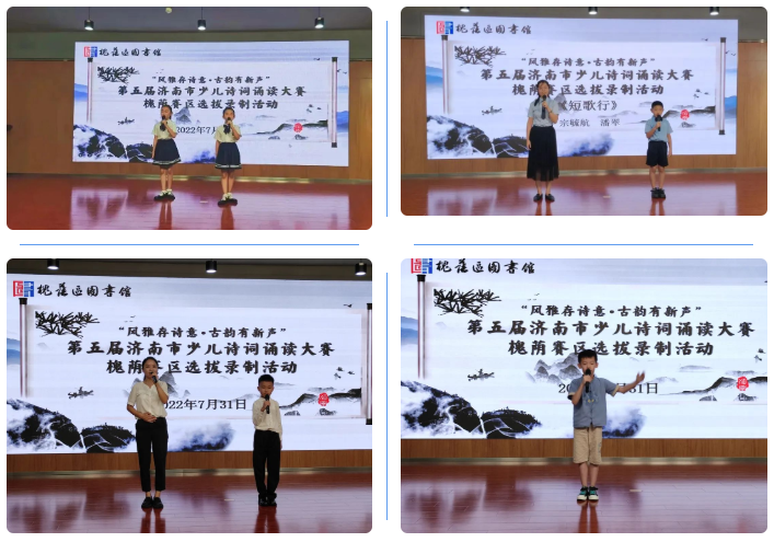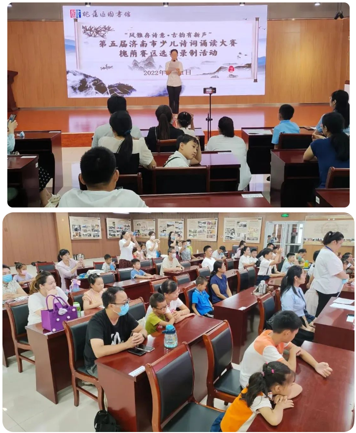 为丰富青少年读者暑期文化生活,营造书香槐荫的良好氛围,2022年7月31日上午,槐荫区新时代文明实践中心、槐荫区图书馆组织开展的“风雅存诗意•古韵有新声”第五届济南市少儿诗词诵读大赛槐荫赛区选拔活动在六楼多功能厅隆重举行,共有四十余位读者到场参与活动。
