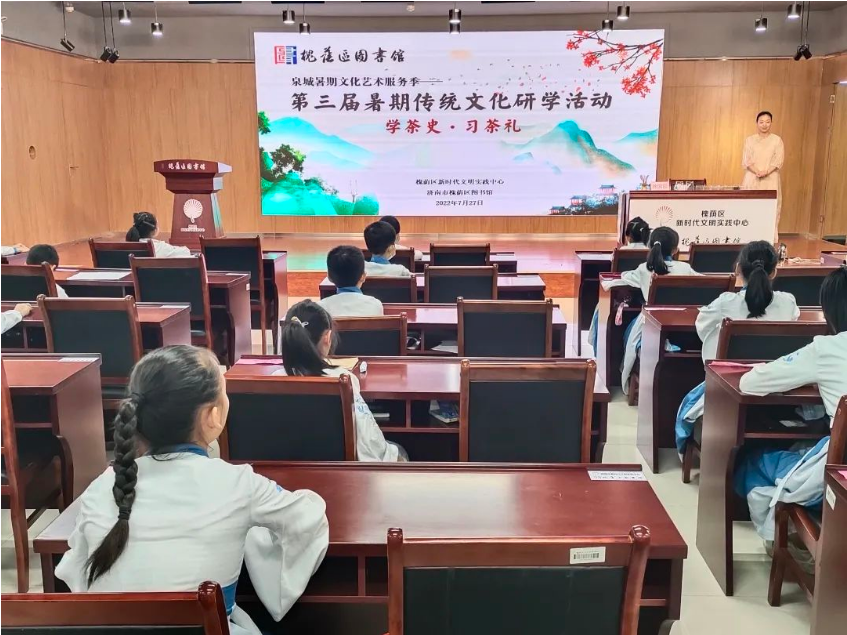 为传承中华茶文化、弘扬中华传统美德,丰富青少年读者的暑期生活,槐荫区新时代文明实践中心、槐荫区图书馆举办第三届品儒槐风国学少年暑期研学活动。2022年7月27日上午,研学系列课程第三讲“学茶史·习茶礼”正式开讲。