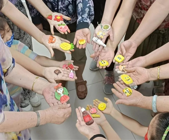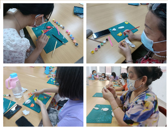 在制作过程中,读者们根据殷老师的讲解,揉搓黏土,大家相互帮助、相互提出奇思妙想,脸上洋溢着幸福的笑容。经过揉捏、造型、组装、勾线、上色等步骤,软软的彩泥变身成小菠萝、小西瓜,个个栩栩如生,等黏土干燥之后再在反面粘上磁铁,一个个可爱又生动的冰箱贴就完成了。