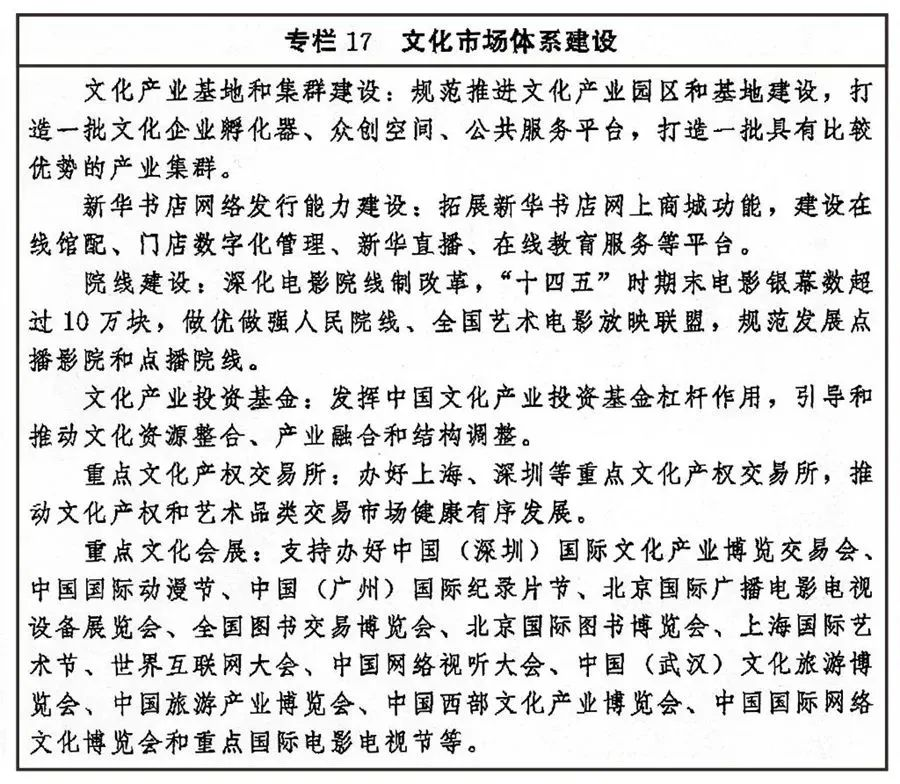 加快构建统一开放、高效规范、竞争有序的文化市场。健全文化市场体系基础制度,完善文化企业坚持正确导向履行社会责任制度。落实统一的市场准入负面清单制度,清理破除文化市场准入隐性壁垒。健全文化要素市场运行机制,促进劳动力、资本、技术、数据等合理流动。加快推进符合文化产业发展需求和文化企业特点的金融产品与服务创新。进一步扩大文化企业股权融资和债券融资规模,支持文化企业上市融资和再融资。探索文化金融服务中心模式,为文化企业提供综合性金融服务。全面促进文化消费,加快发展新型文化消费模式,发展夜间经济。加强文化市场信用体系建设,提升文化市场服务质量,强化文化市场管理和综合执法。