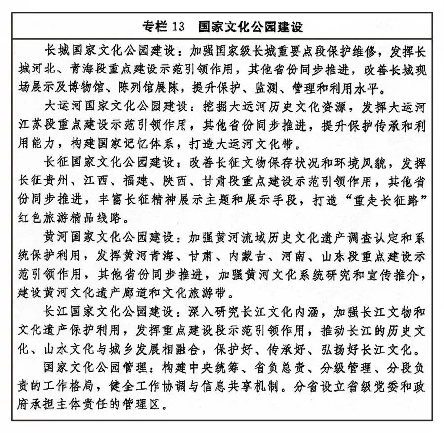 整合长城、大运河、长征、黄河、长江沿线等重要文化资源,强化文物和非遗真实完整保护传承,重点建设管控保护、主题展示、文旅融合、传统利用等主体功能区,系统推进保护传承、研究发掘、环境配套、文旅融合、数字再现等重点基础工程,实施公园化管理运营,形成具有特定开放空间的公共文化载体,集中打造中华文化重要标志。