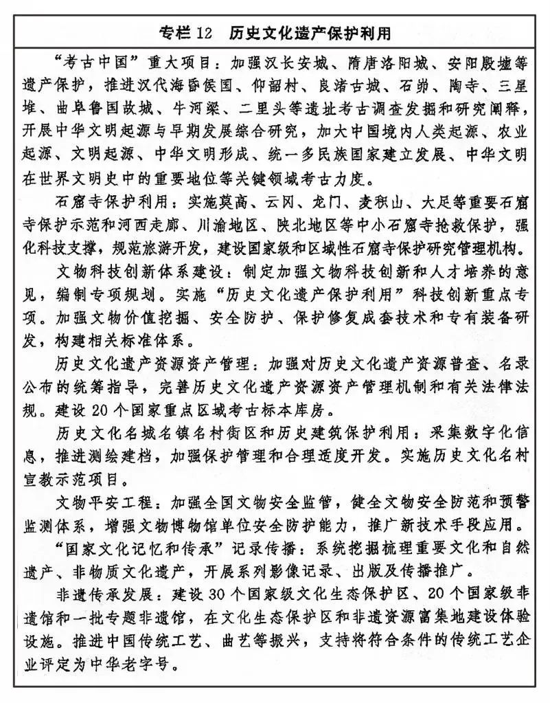 树牢保护历史文化遗产责任重大的观念,增强对历史文物的敬畏之心。全面加强考古工作,健全“先考古、后出让”制度。加强文物科技创新。统筹指导各类文物资源普查和名录公布,编制文物保护单位保护规划等专项规划,纳入国土空间规划实施。推进世界文化遗产申报、保护管理和展示宣传。加强不可移动文物和馆藏文物保护修复。加大流失文物追索返还工作力度。推进文物合理利用,建设国家考古遗址公园、文物保护利用示范区、文化遗产廊道,推介以文物资源为载体的国家文化地标和中华文明标识体系。实施中华文物全媒体传播计划。健全文物安全长效机制,严厉打击文物犯罪。