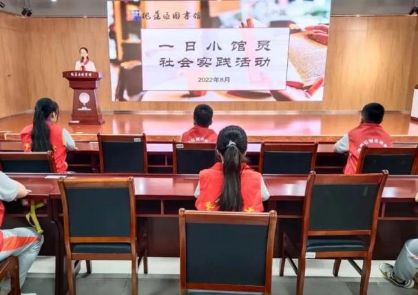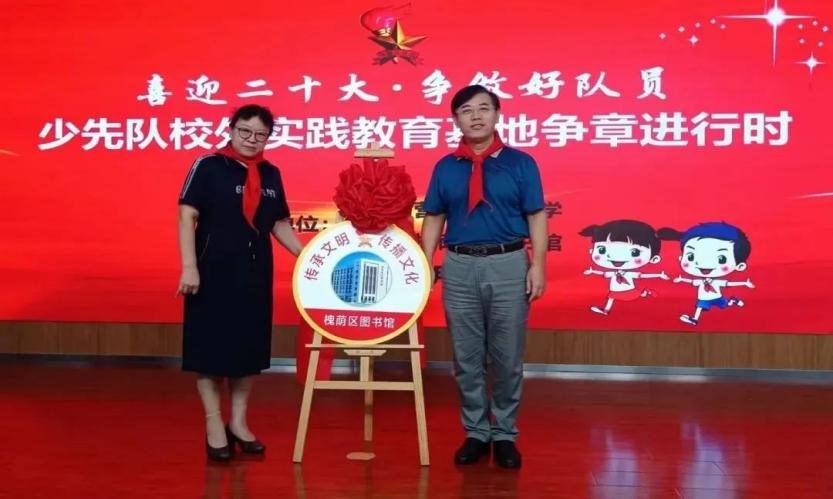 为深入学习贯彻习近平总书记关于少年儿童和少先队工作的重要论述,全面贯彻落实《中共中央关于全面加强新时代少先队工作的意见》,充分发挥少先队实践育人作用,提升少先队社会化工作水平,完善少先队校外实践教育阵地建设,济南市营市东街小学联合槐荫区图书馆举行少先队校外实践教育基地揭章仪式。槐荫区图书馆馆长程玉霞、济南市营市东街小学校长董庆峰以及来自营市东街小学的少先队员和红领巾讲解员等 20 余人参加本次揭章仪式。