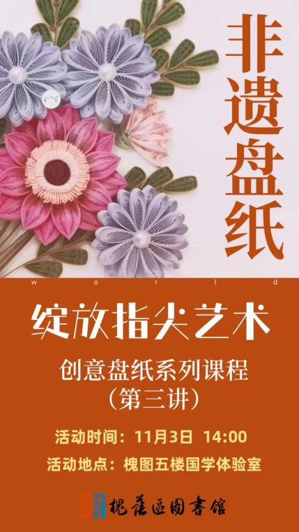 活动简介:为弘扬传统文化,传承传统手工艺术,丰富读者的精神文化生活,建立起图书馆与读者、读者与读者之间的交流平台,槐荫区图书馆(槐荫区新时代文明实践中心)举办“绽放指尖艺术”非遗盘纸创意课程旨在建立与读者的深度交流,带领读者体验盘纸艺术的魅力。