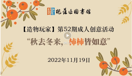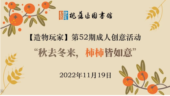 2022年临近岁末,疫情反复、来势汹汹,形势严峻,这个周末,让我们“静”下来。在疫情防控期间,为了丰富广大读者的精神文化生活,让读者在家也能参与文化活动,11月19日,槐荫区图书馆(槐荫区新时代文明实践中心)举办的造物玩家第52期成人创意手工活动“秋去冬来,柿柿皆如意”以线上分享的形式与读者见面了。