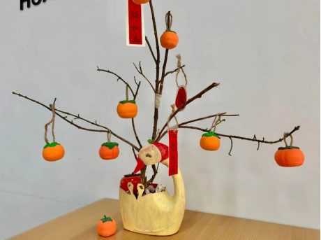 秋去冬来万物休,唯有柿树挂灯笼。“柿”因其谐音“事”,古人便将诸多喜庆吉利的内涵融入其中,如心想柿成、柿柿如意。本次活动中,槐图赵老师带大家用彩泥、枯树枝等常见材料制作这款充满秋日气息的手工艺品——“秋去冬来,柿柿皆如意”。