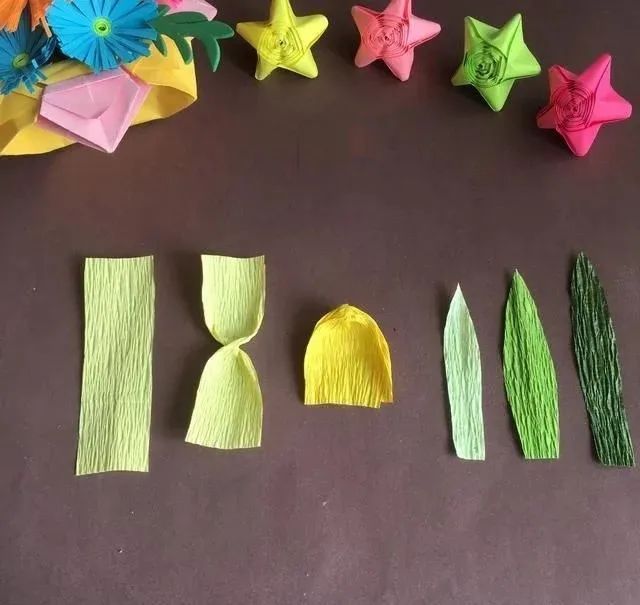 3、绿色皱纹纸,裁成1.5x4 cm及1.5x6 cm的小条;