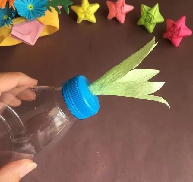 3、将5-6片叶子固定成圈,用热熔胶枪粘于瓶盖中间;