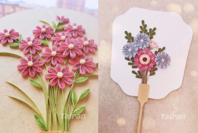 盘纸作为指尖上的艺术有着悠久的文化历史,是盘绕纸条使之卷曲成形,并以纸的自身颜色搭配及纸张独特的肌理效果为基础元素,使用牙签、镊子、卷纸笔等手工艺工具,经过细致的“盘、编、剪、搓、捏、折、压、粘”等手法,来组合完成一件件精巧立体的工艺品。使用盘纸技艺制作的装饰画、装饰摆件、挂件、扇面、首饰等工艺品深受人们喜爱。