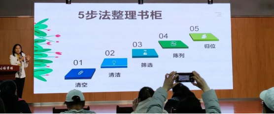 讲座中,杨老师分享了家居生活中图书的收纳整理方法,着重讲解了书房中书柜、书架的整理流程和各类图书的摆放方式,以及书橱的黄金区、彩虹收纳法等生活美学的相关知识。