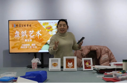 为推进精神文明建设,丰富读者精神文化生活,2023年3月16日下午,槐荫区图书馆(槐荫区新时代文明实践中心)在五楼尼山书院开展了“绽放指尖艺术”创意盘纸系列公益课(2023第五讲)活动,二十余位读者到场体验盘纸文化,感受指尖艺术。