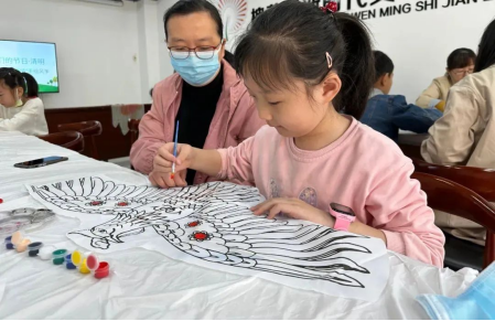 在老师的指导和家长陪伴下,小读者们发挥自己的想象,构思、调色、涂色,五彩斑澜的童心世界跃然纸上。蝴蝶风筝、凤凰风筝、金鱼风筝,色彩斑斓、形式多样,栩栩如生。
