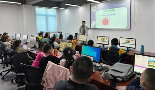活动现场,编程老师首先播放了“新冠病毒科普动画作品”的动画效果,然后通过实操和理论相结合的方式详细讲解了如何使用画图工具绘制“人物”“病毒”“口罩”等元素并引导小读者们制作病毒传播途径的动画。