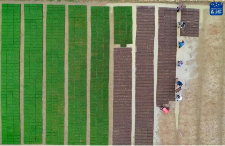 5月20日,浙江省杭州市临安区天目山镇的农民在稻田里劳作(无人机照片)。新华社发胡剑欢摄