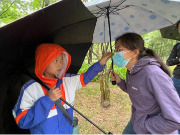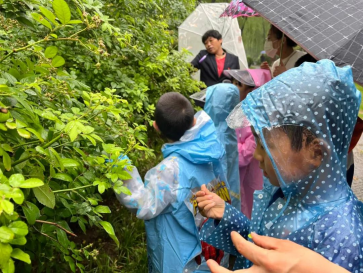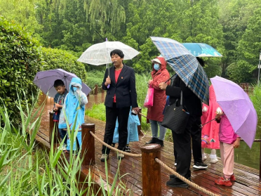 随后,在森林公园植物科普专家于老师的带领下,读者们撑着小花伞、身穿雨衣,呼吸着新鲜空气,行进在公园的健身步道,近距离观察了云杉、银杏树、红叶石楠、蔷薇、竹子、柳树、花叶芦竹、粉花绣线菊、珍珠梅、玉簪、荆树,马尼拉草、狼尾草、荇菜等植物。