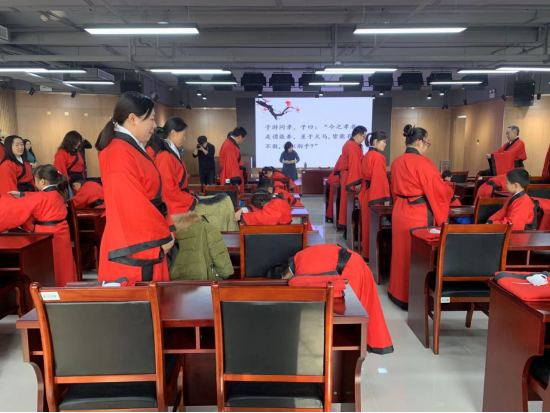 到了习古礼环节,晏老师通过日常的一餐一饭举例让孩子们明白何为“孝”,何为“敬”,带领孩子们学习如何向长辈行礼,如何在生活中的点点滴滴来尊敬长辈,尊敬师长。