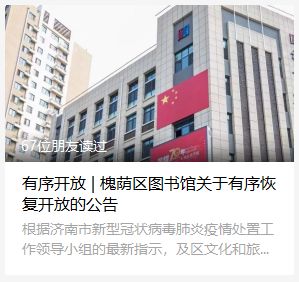 图书馆将根据疫情防控进展和开放实际情况,及时调整服务规则和服务范围。敬请通过槐荫区图书馆官网、微信公众号等渠道及时了解最新动态。