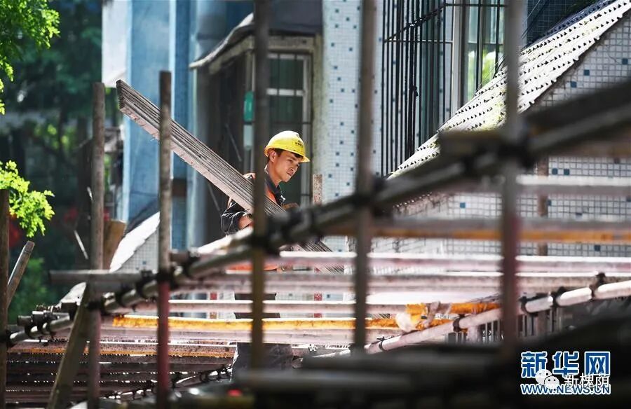 4月26日,工人在重庆市渝中区大溪沟街道双钢路社区改造提升项目施工现场作业。 新华社记者 王全超 摄