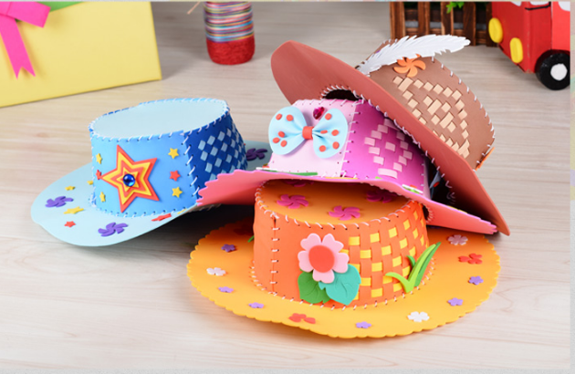 活动中,我们设计了多款太阳帽,有甜美的,有炫酷的,制作过程均用到了编织、缝合、拼贴等方法,锻炼了大家手部精细动作的控制能力。