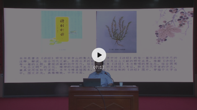 为了更好地解读诗经,大众讲坛邀请山东省图书馆中文图书典阅部主任、副研究馆员、博士金晓东,做了《为何推广<诗经>》 《<诗经>中的爱国主义诗篇》 《<诗经>中的孝顺父母诗篇》《<诗经>中的祝福诗篇 》《如何推广诵读<诗经>》等诗经解读讲座,7月20日起将陆续在微信推出。