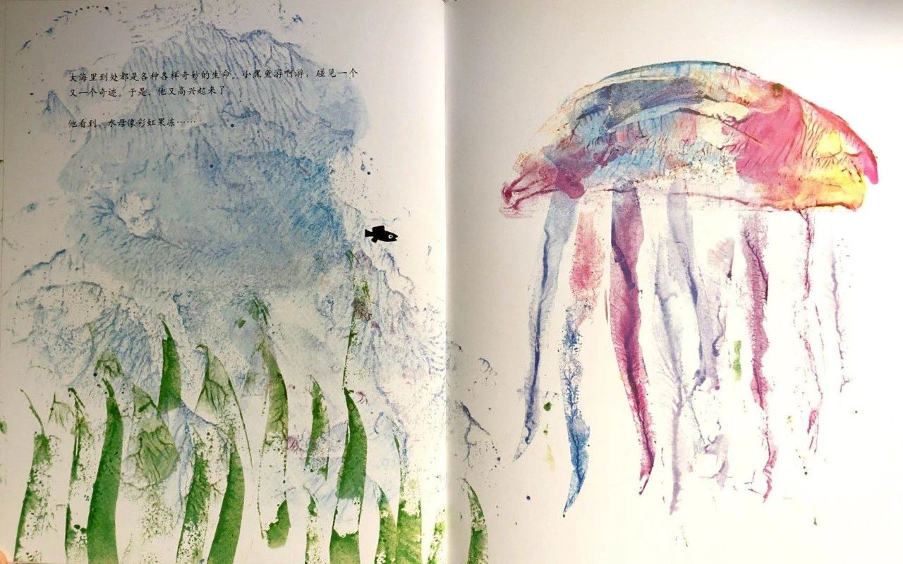 大海里到处都是各种各样奇妙的生命。小黑鱼游啊游,碰见一个又一个奇迹。于是,他又高兴起来了。他看到,水母像彩虹果冻……