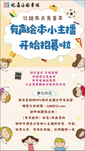 亲爱的小读者们,槐荫区图书馆有声绘本小主播持续招募中,无论你的声音是字正腔圆、软萌甜美、还是神秘沙哑、磁性动听,请大声勇敢的show出来,将音频文件、个人简介及靓照一张发送至槐图公共邮箱:hylib@126.com,我们期待听到你声音!