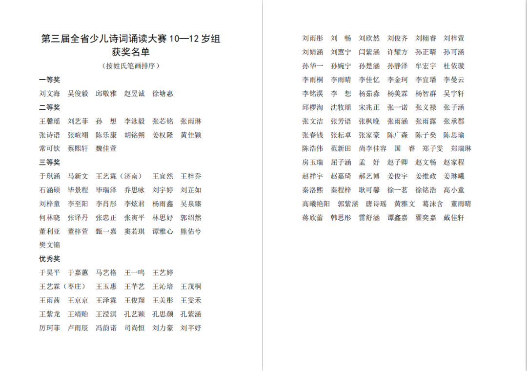 经过两个多月紧张有序的比赛,第三届全省少儿诗词诵读大赛的比赛评审工作顺利完成,现将获奖情况进行公告(获奖名单按姓氏笔画排序)。