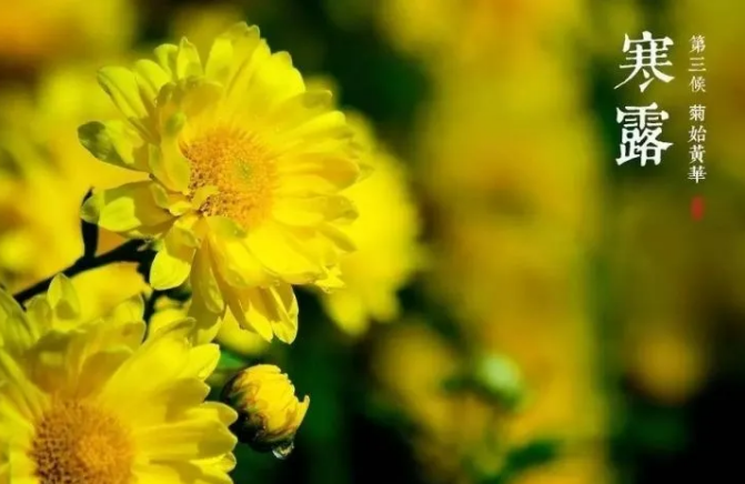 古代,人们还把寒露分为三候:“一候鸿雁来宾;二候雀入大水为蛤;三候菊始黄华。”其中“菊始黄华”指的便是菊花寒露时节普遍开放。由于接近重阳节,某些地区也有“饮菊花酒”的习俗。据悉,在寒露这一天,古人还要取井中的水来浸造滋补五脏的丸药或药酒。